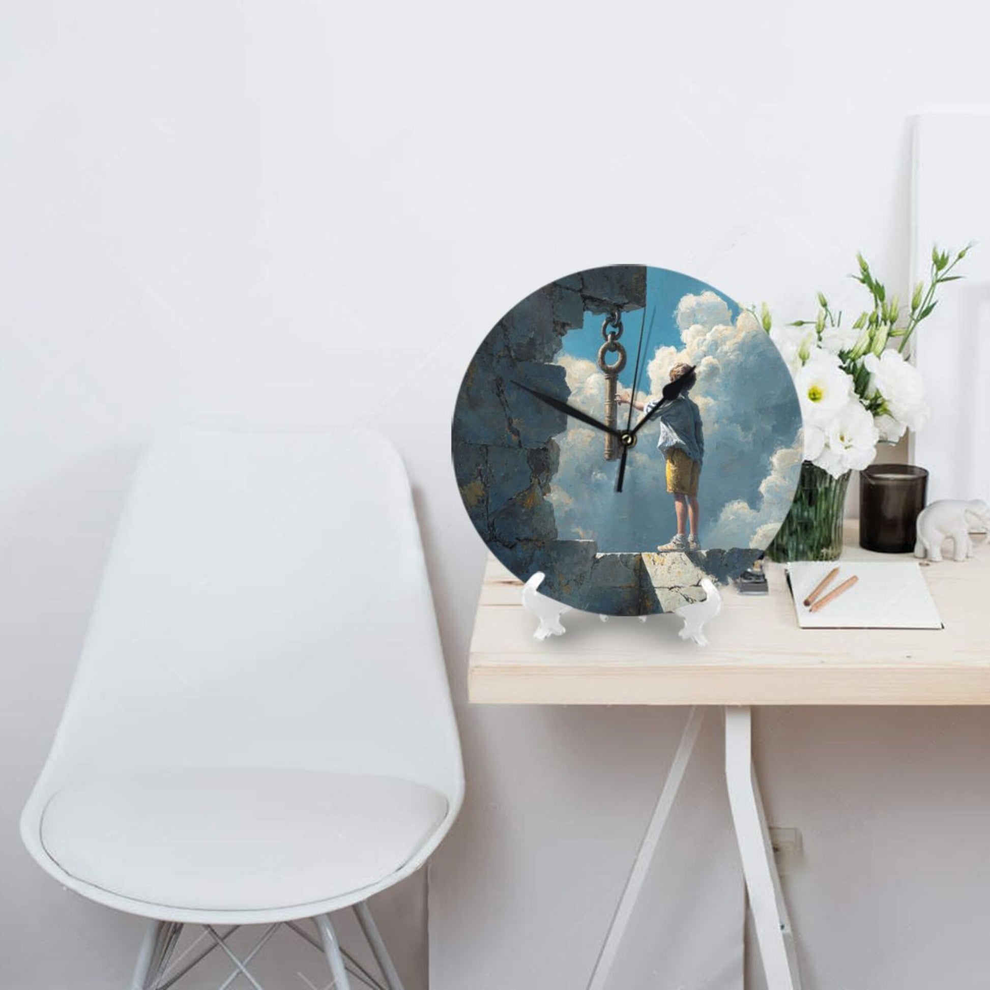 This 25cm silent wall clock captures a surreal and poetic moment: a young boy stands at the edge of a crumbling stone wall, reaching toward a giant floating key suspended in the sky. The background bursts with textured clouds and a vivid blue sky, painted in a digital oil-painting style that blurs the boundary between dream and memory. The image evokes themes of hope, curiosity, and the desire to unlock one’s destiny.