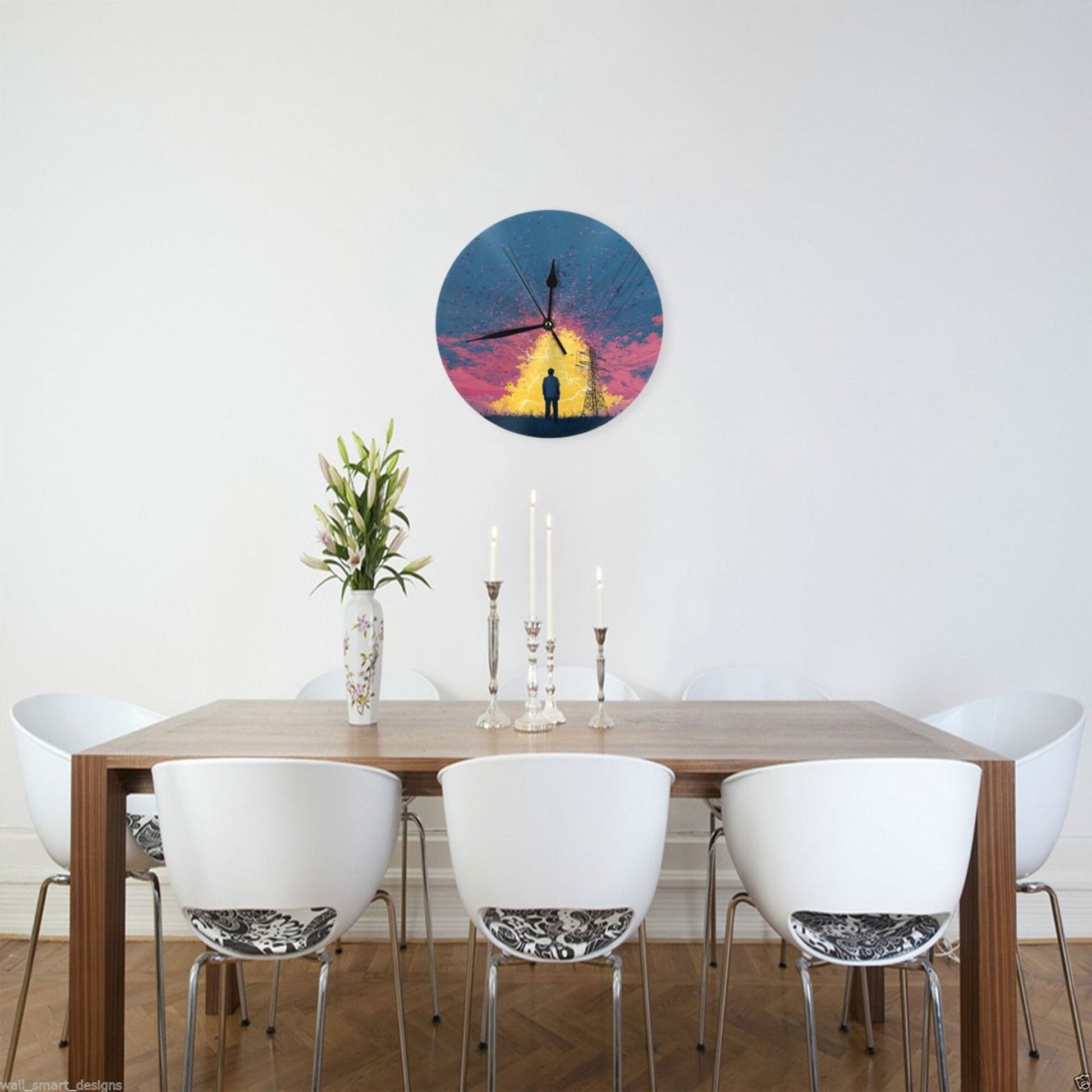 This 25cm silent wall clock features a captivating illustration of a lone figure standing before a glowing electric field and transmission towers. The surreal sky bursts into colors of deep blue and vibrant magenta, creating a dramatic contrast with the radiant yellow core, where streaks of lightning suggest energy, awareness, and a sense of cosmic awakening. The central silhouette, facing away from the viewer, evokes a contemplative mood—a quiet moment of introspection as if absorbing the mysteries of time and power.